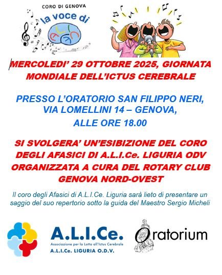 IL ROTARY CLUB GENOVA NORD-OVEST ORGANIZZA IN COLLABORAZIONE CON A.L.I.CE. LIGURIA ODV UNA ESIBIZIONE DEL CORO DEGLI AFASICI DI GENOVA PRESSO L'ORATORIO SAN FILIPPO NERI, VIA LOMELLINI 14 - GENOVA IN DATA 29-10-2025 ALLE ORE 18.00